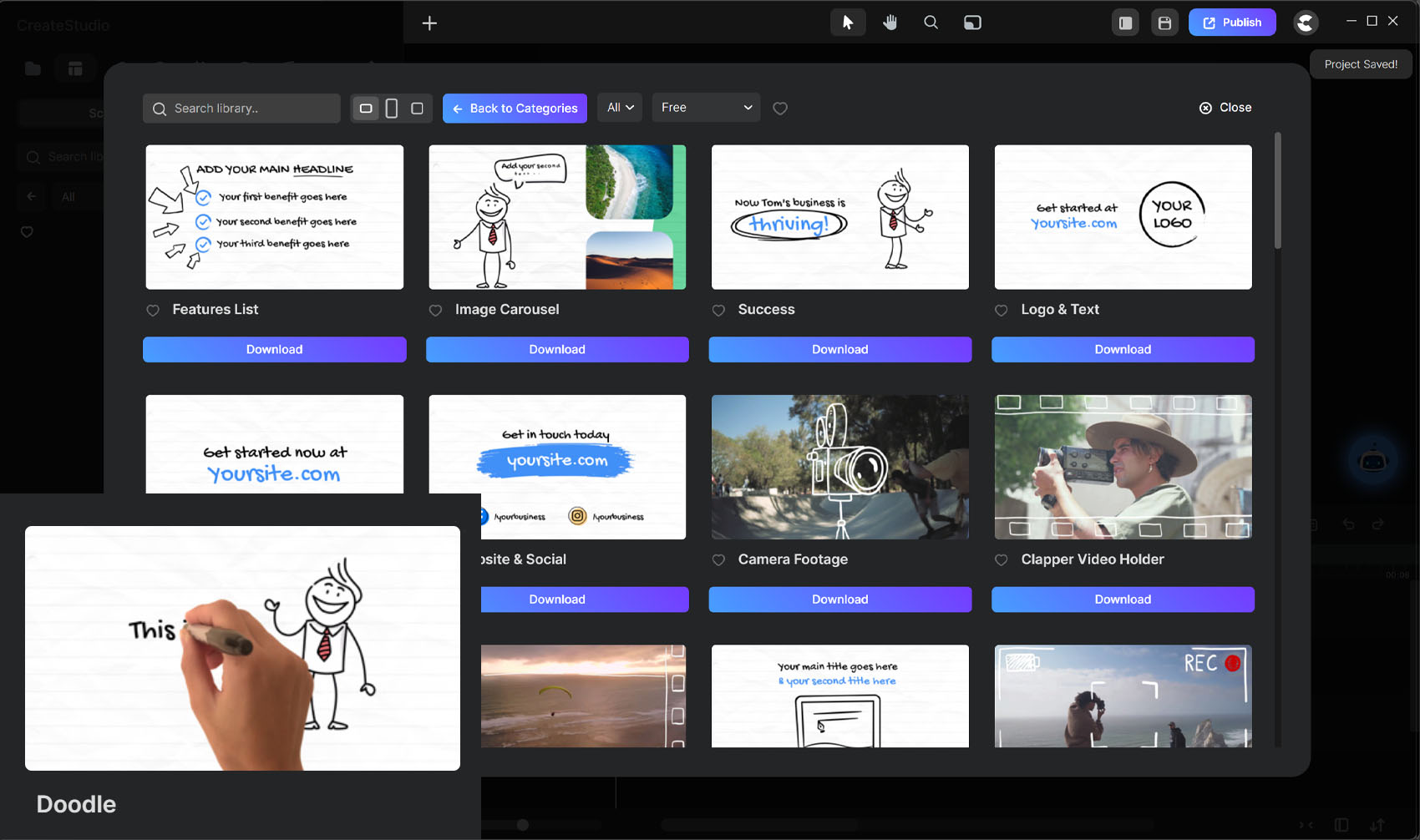 Klik op een thema om het bijbehorende paneel te openen met scènes en animaties. Download een scène en sleep het naar je tijdlijn. Pas het daarna eenvoudig aan naar jouw stijl.